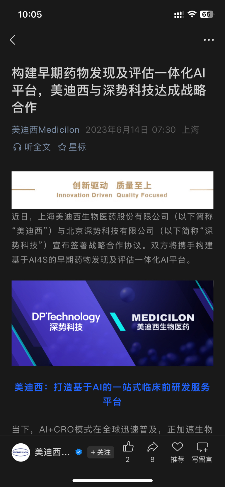 $美迪西(SH688202)$ 美迪西作为一站式临床前综合研发服务CRO,与AI4S践行者深势科技于2023年6月签署战略合作协议,目标是整合美迪西在药物发现和临床前研究中的实验数据与合成能力,以及深势科技的AI4S计算平台(如Hermite和Uni-Mol预训练模型),以提升候选药物筛选效率、优化化合物设计并缩短研发周期。
