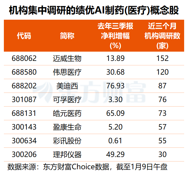 东方财富Choice数据显示,去年前三季度业绩向好,且近三个月获机构扎堆调研的AI制药(医疗)概念股共8只,迈威生物、伟思医疗分别获152家、120家机构调研,美迪西近三个月的机构调研数达87家,可孚医疗、皓元医药均获超70家机构关注。