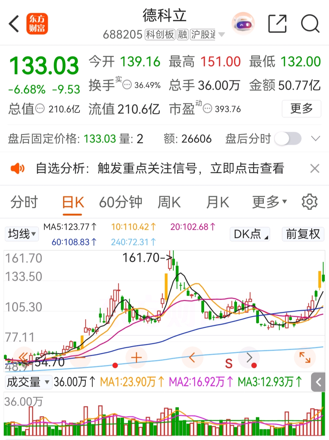 虽然冲高回落,但好的一点是价格依旧在5日均线之上,可以观望。破5日均线果断离场。