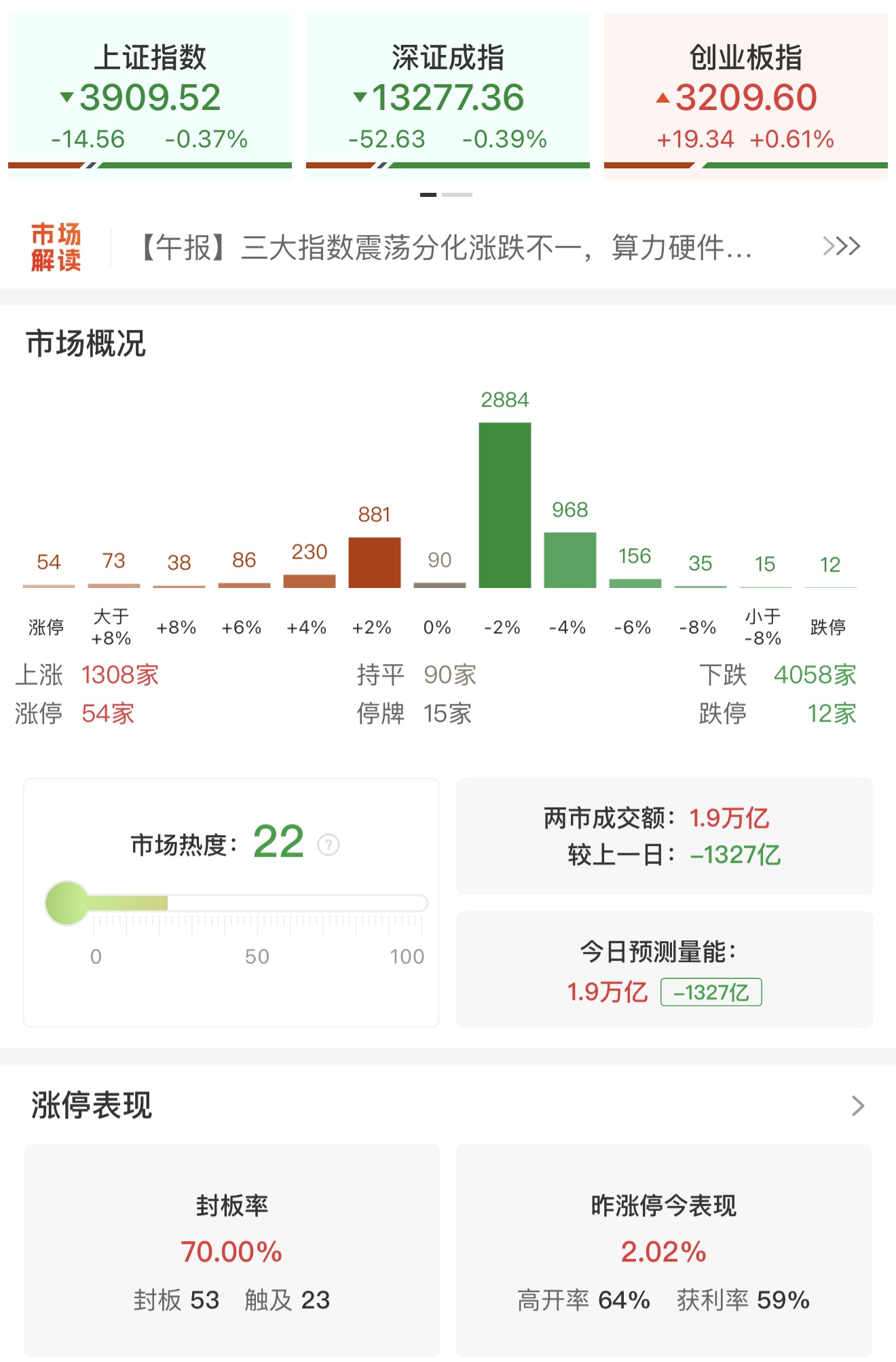 财联社12月9日电,三大指数涨跌不一,沪指、深成指震荡回落,创业板指冲高回落尾盘拉升。沪深两市成交额1.9万亿,较上一个交易日缩量1327亿。盘面上,全市场超4000只个股下跌。从板块来看,算力硬件概念全线走强,德科立20cm涨停,福晶科技、天孚通信再创历史新高,胜宏科技涨超10%。福建板块反复活跃,安记食品6连板,舒华体育4连板,东百集团、厦门港务双双3连板。零售板块表现活跃,永辉超市、茂业商业、中央商场涨停。下跌方面,海南本地股集体大跌,新大洲A跌停。板块方面,算力硬件、零售、福建等板块涨幅居前,海南、有色金属、煤炭等板块跌幅居前。截至收盘,沪指跌0.37%,深成指跌0.39%,创业板指涨0.61%。