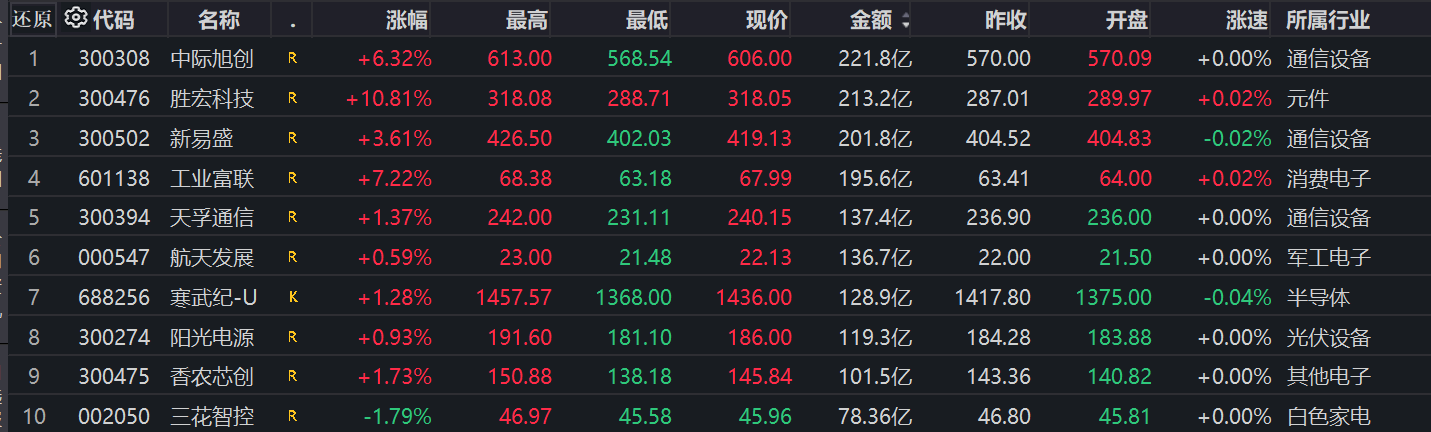 个股方面,中际旭创、胜宏科技、新易盛成交额均超200亿元。