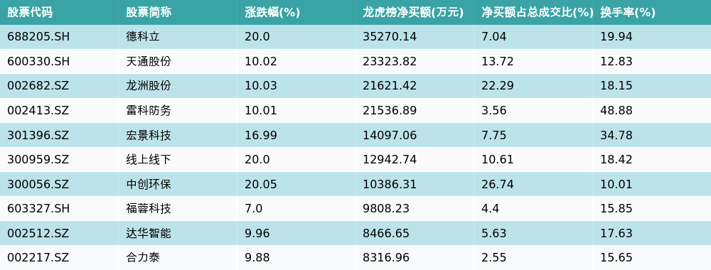 南财智讯12月9日电,南财金融终端数据显示,因当日异动登上龙虎榜的个股中,资金净买入最多的前三位分别是德科立(688205.SH)、天通股份(600330.SH)与龙洲股份(002682.SZ)。其中排名第一的德科立净买额达3.53亿元,占总成交金额的7.04%。德科立当日收盘上涨20.0%,换手率为19.94%,净买入额前10个股详情见下图: