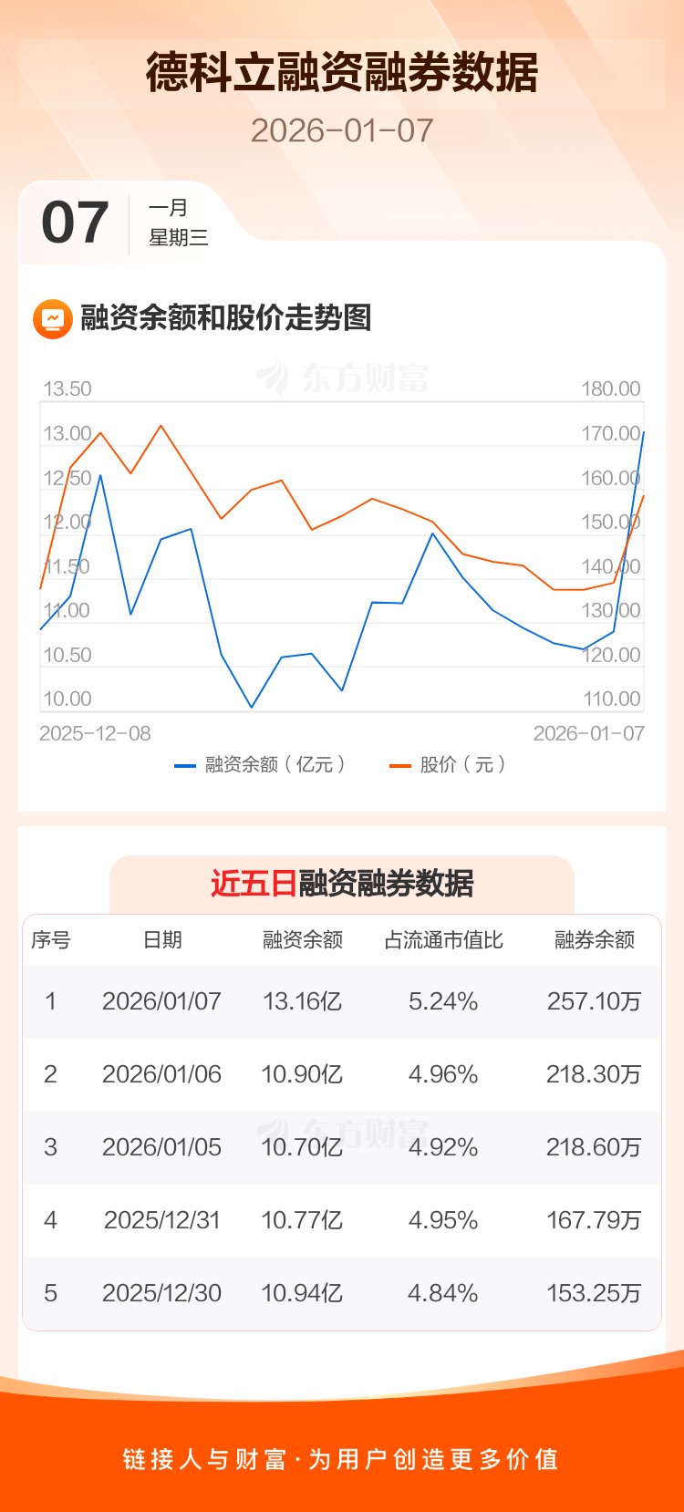 交易所最新数据显示,德科立于2026年1月7日获融资买入5.92亿元,融资偿还3.65亿元,当日融资净买入2.26亿元。目前,该股融资余额13.16亿,占流通市值比例为5.24%。