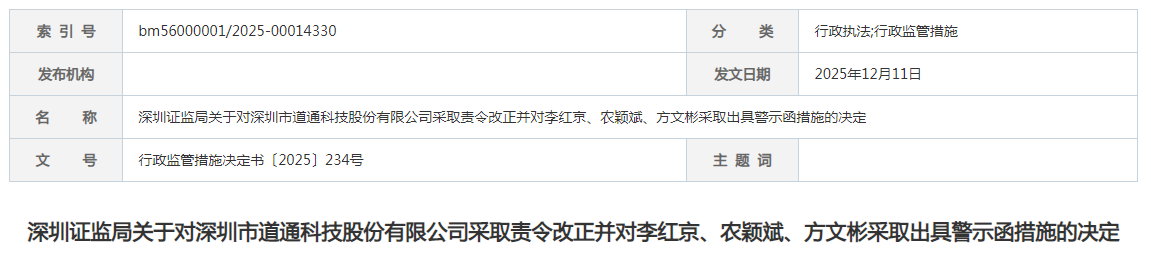 12月11日中国证监会深圳监管局公告,对道通科技(688208)采取责令改正并对李红京、农颖斌、方文彬采取出具警示函措施的决定。