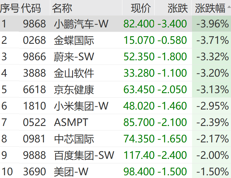 港股市场上午短暂冲高,随后震荡下挫。截至发稿,港股三大指数均已飘绿,恒生科技指数跌超1%。小鹏汽车跌近4%,领跌恒生科技指数成份股。