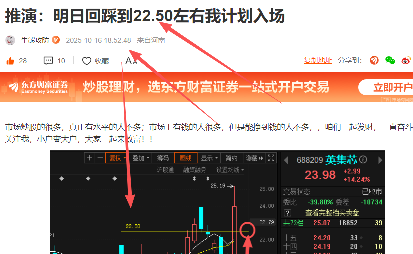 上周五大盘环境非常差,很多人都被套,但是我发的这个精准回踩到我推演的位置左右,也成功低吸入场。今天周一拉升时23.55左右获利出来,短线一进一出盈利4%左右!提示:有没有大老板招操盘手的,我想找个工作做,有招操盘手的记得给我留言!