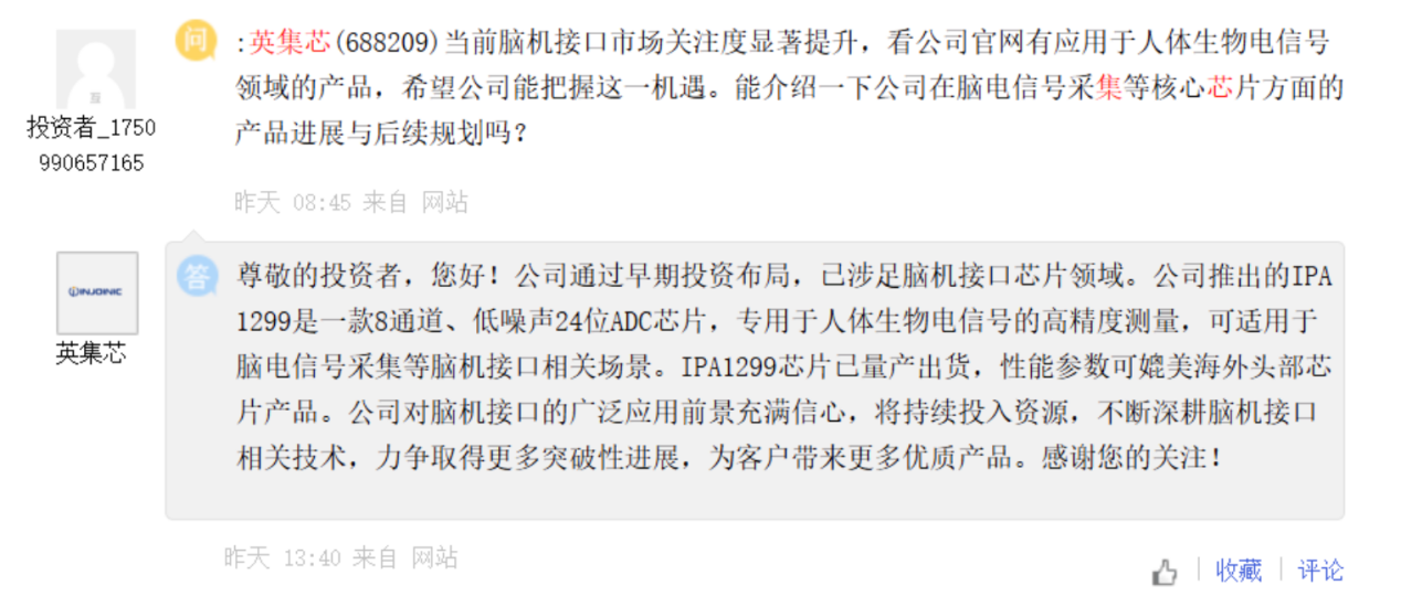 2026年1月6日午间13时40分,英集芯在未提前发布正式公告的情况下,在上证E互动平台以“投资者提问、公司回复”的形式对外释放信息,声称公司所推出的IPA1299芯片专用于人体生物电信号的高精度测量,可适用于脑电信号采集等脑机接口相关场景,且该芯片已实现量产出货,性能参数能够媲美海外头部芯片产品。