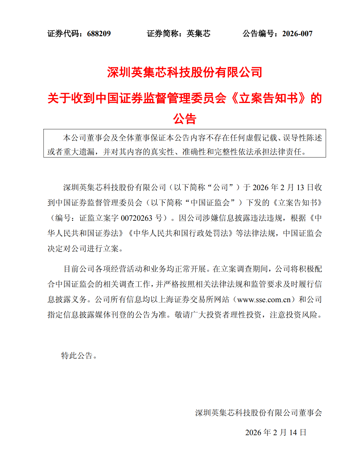 蓝鲸新闻2月13日讯2月13日晚,英集芯(688209.SH)发布公告称,公司收到中国证券监督管理委员会下发的《立案告知书》,因涉嫌信息披露违法违规,决定对公司进行立案调查。