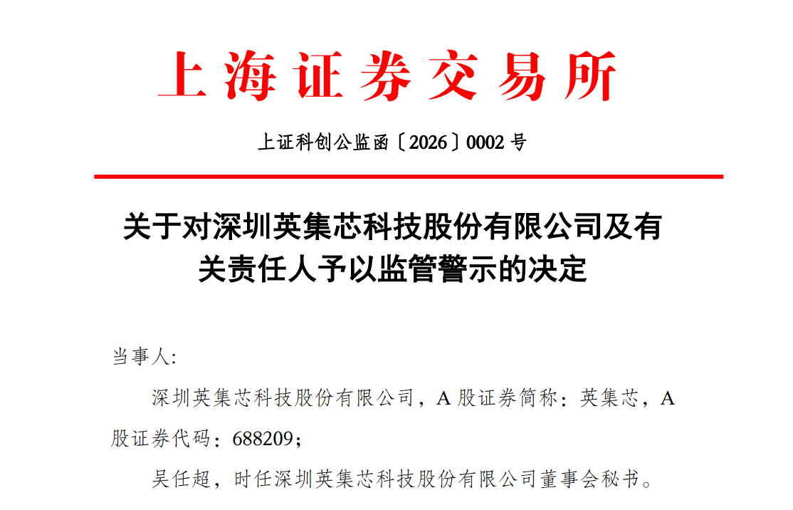 对此,1月7日晚间,上交所发布对英集芯和公司时任董事会秘书吴任超予以监管警示。