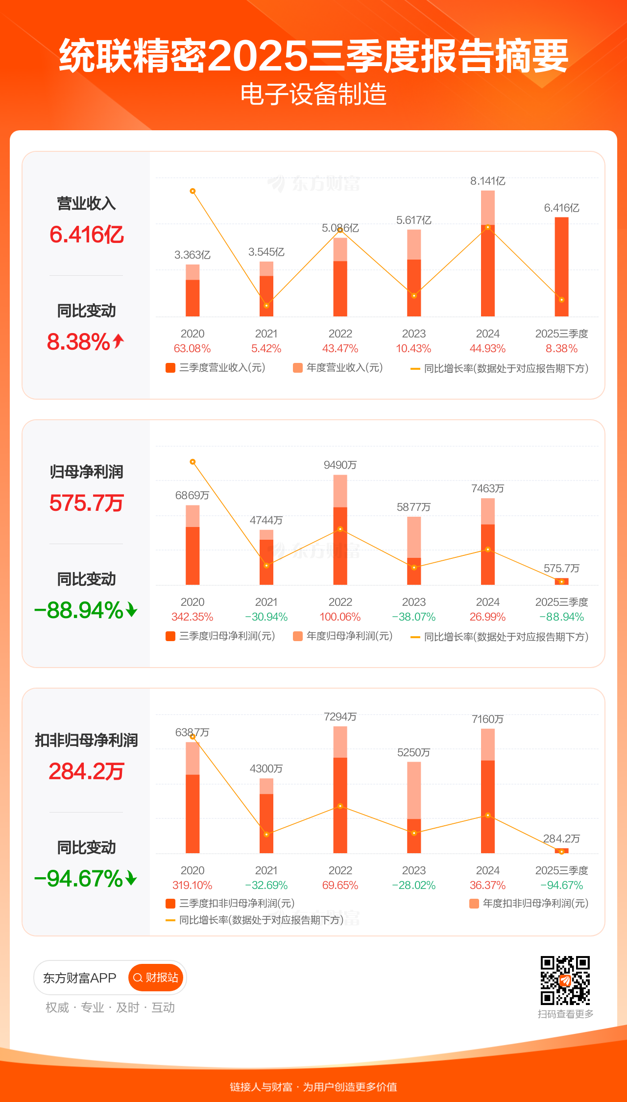 统联精密10月31日发布2025年三季报显示,公司前三季实现营业收入6.42亿元,同比增长8.38%;归母净利润575.71万元,同比下滑88.94%;扣非归母净利润284.25万元,同比下滑94.67%。