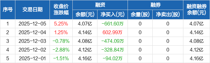 统联精密:融资净偿还661.6万元,融资余额4.07亿元(12-05)
