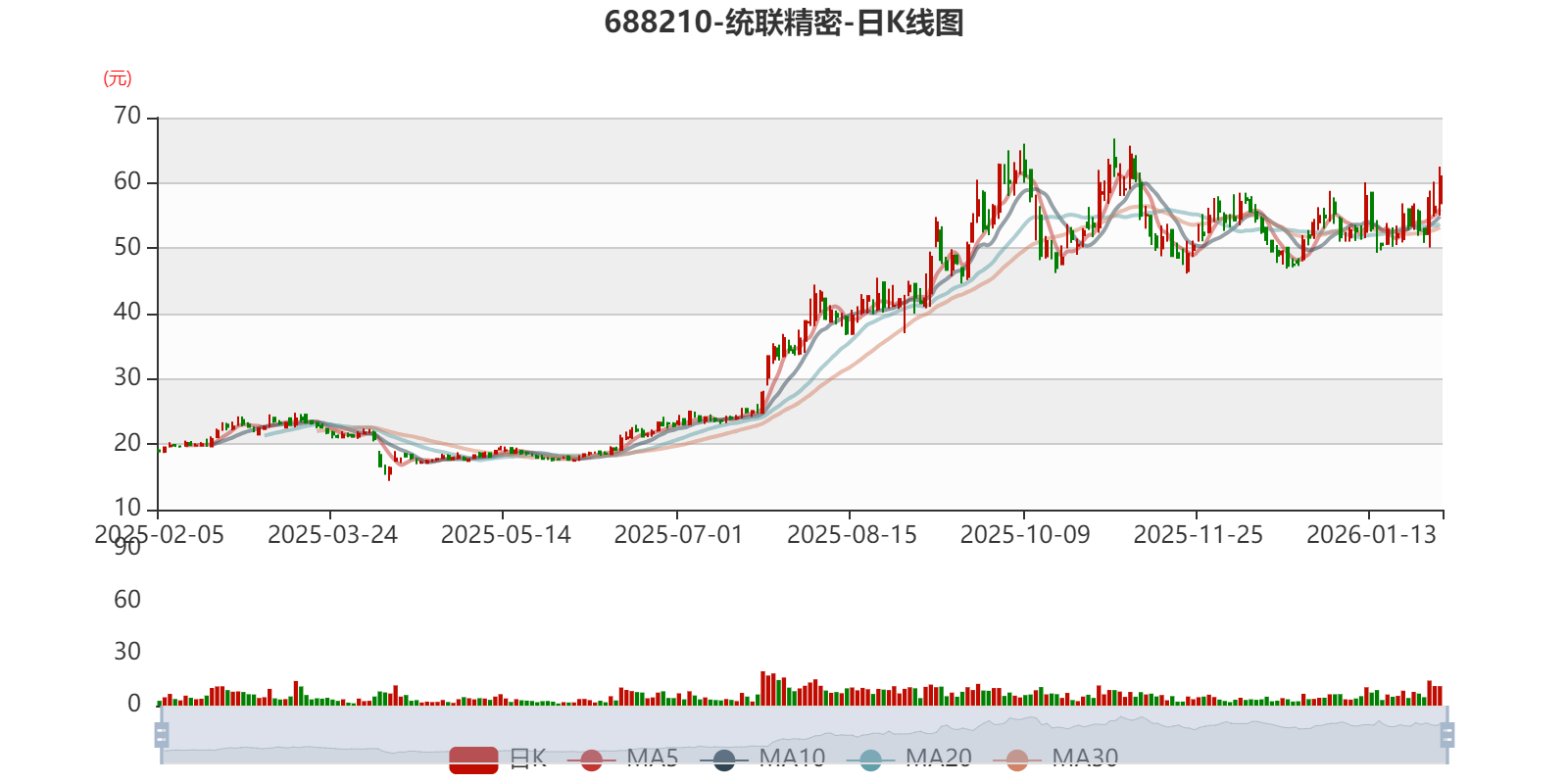 中证智能财讯统联精密(688210)1月30日晚间披露2025年度业绩预告,预计2025年实现营业收入8.4亿元至8.6亿元;归母净利润亏损360万元至540万元,上年同期盈利7463.31万元;扣非净利润亏损650万元至975万元,上年同期盈利7160.03万元。以最新收盘价计算,市净率(LF)约7.57倍,市销率(TTM)约11.62倍。