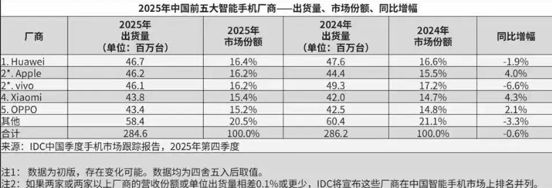 IDC 2025 中国手机市场报告:华为登顶榜首 自研芯片 + 鸿蒙生态筑牢技术护城河
