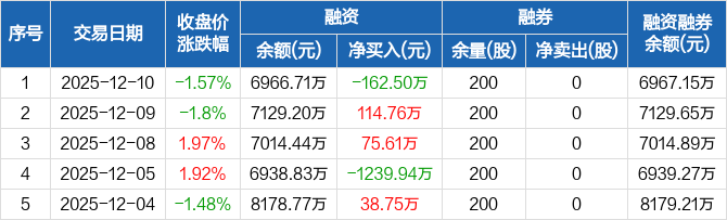 气派科技:融资净偿还162.5万元,融资余额6966.71万元(12-10)