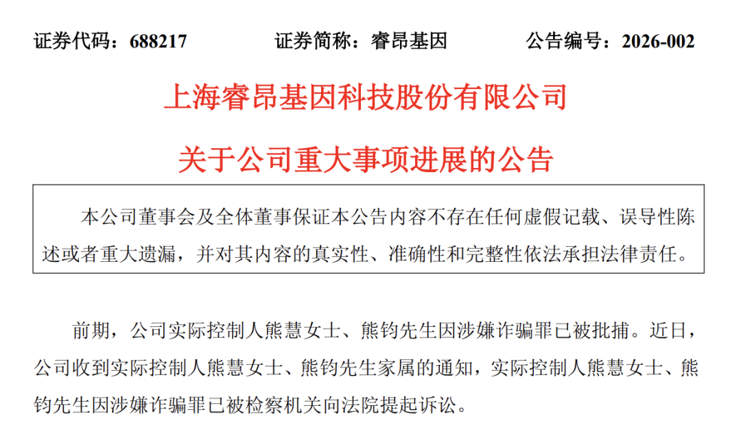 公告回溯至2024年10月,睿昂基因披露,熊慧、熊钧以及时任副总经理何俊彦和薛愉玮的强制措施变更为刑事拘留,涉嫌罪名变更为诈骗罪。同年12月,公司称,熊慧、熊钧因涉嫌诈骗罪已被批捕,并移交检察机关,相关事项尚待进一步调查。
