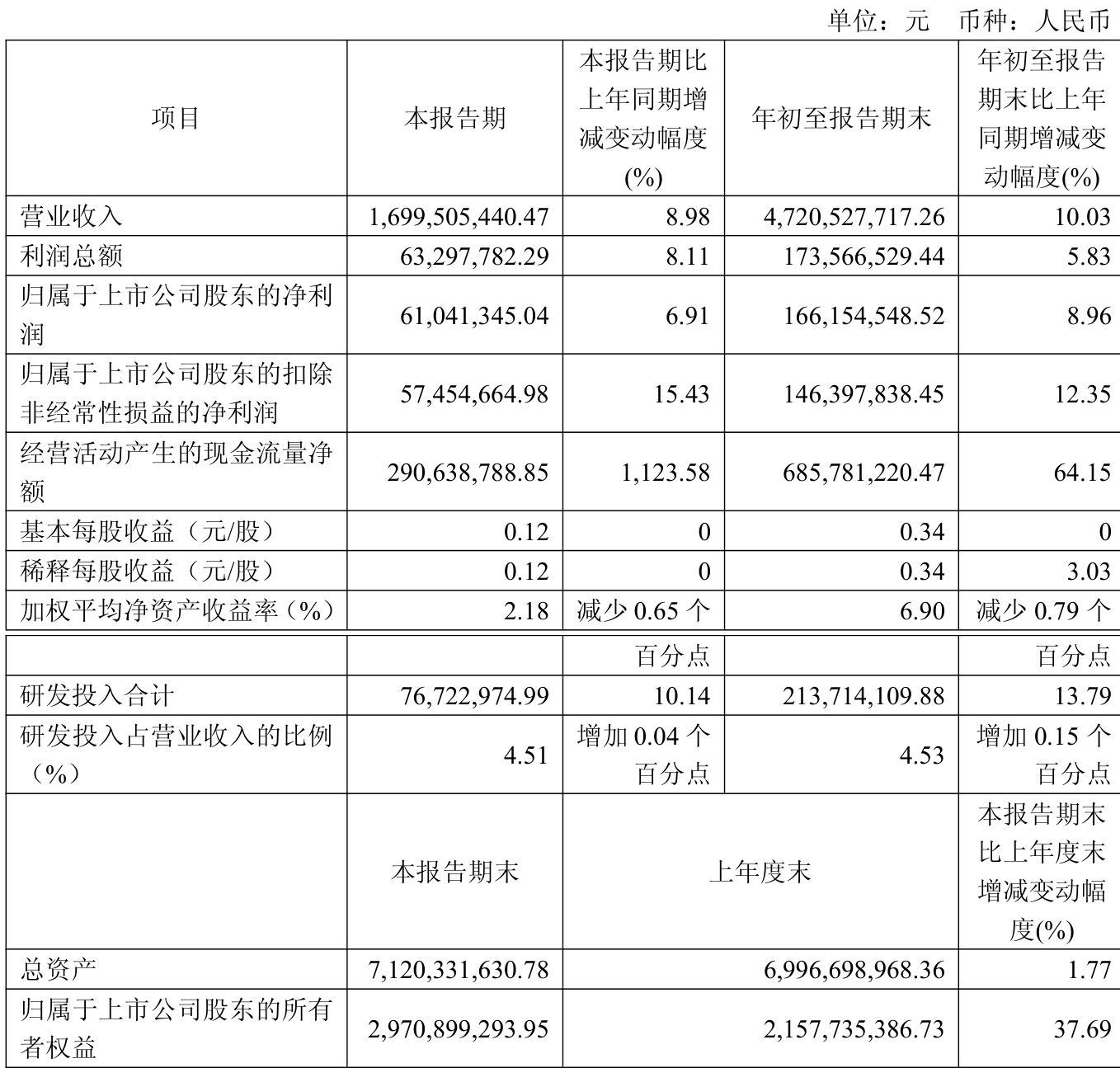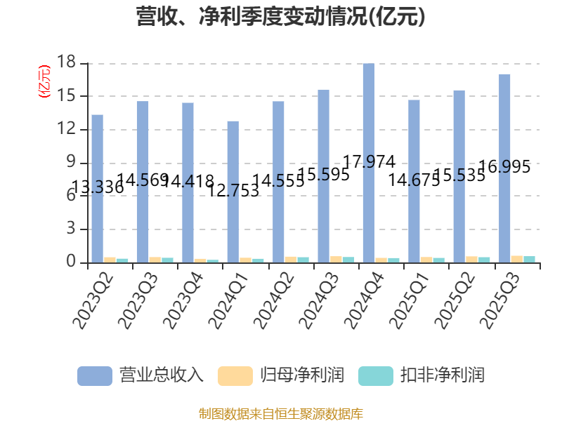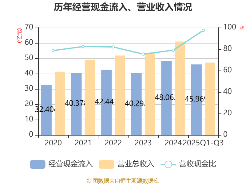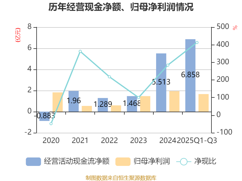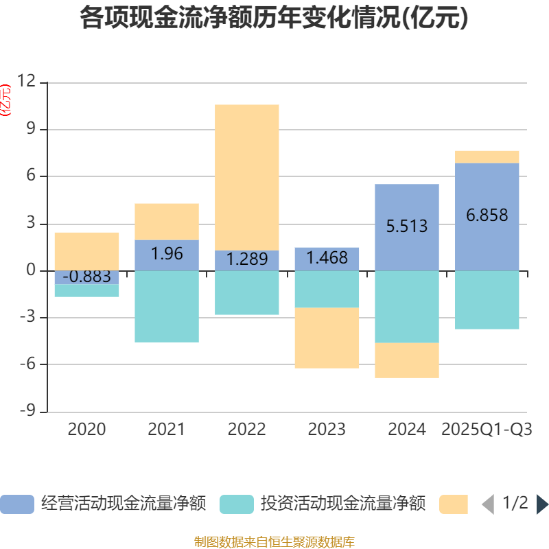 2025年前三季度,公司经营活动现金流净额为6.86亿元,同比增长64.15%;筹资活动现金流净额7746.29万元,同比增加2.29亿元;投资活动现金流净额-3.74亿元,上年同期为-4.19亿元。