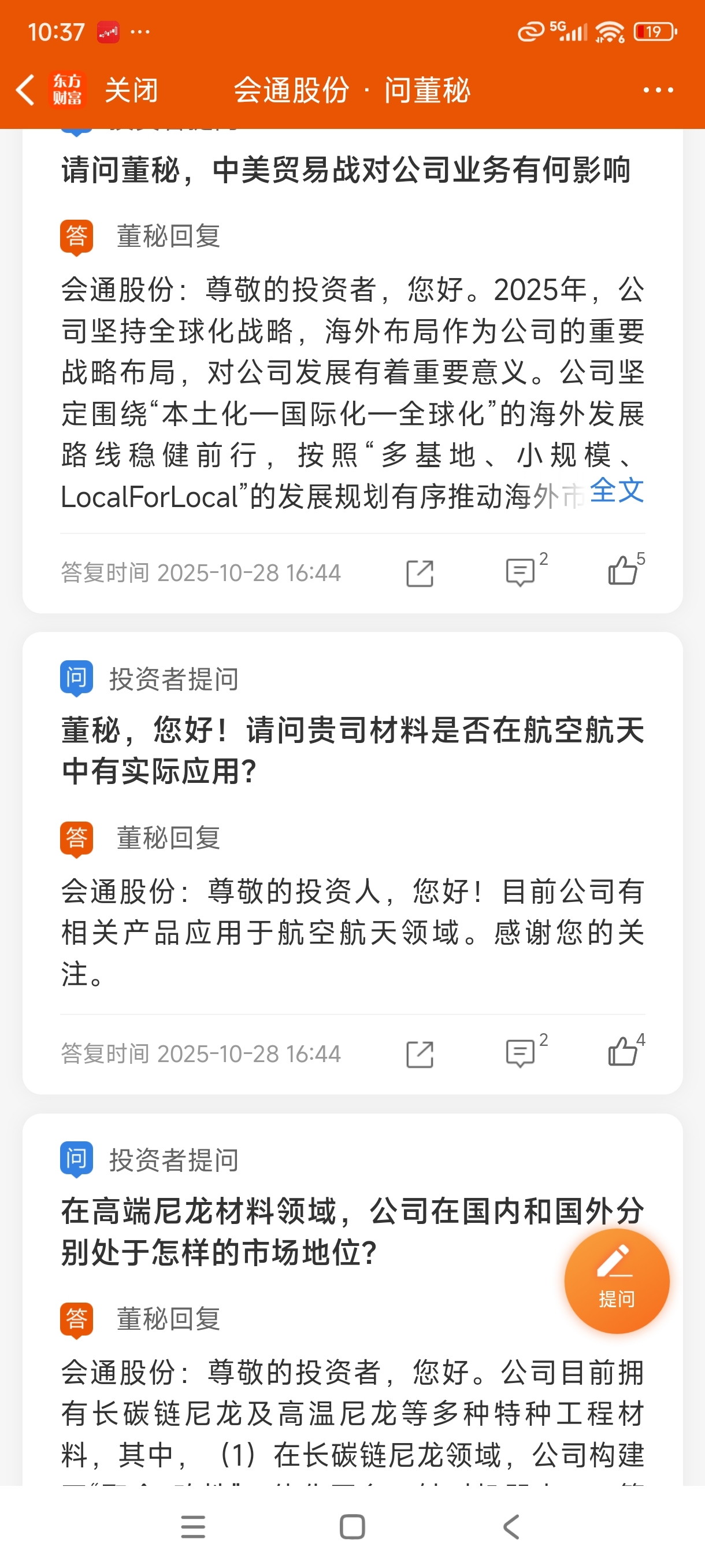 $会通股份(SH688219)$ 10月28日回复有产品用于航天航空,今天就回复去看定期报表,怕惹事上身,这样的董秘能干啥事,好公司