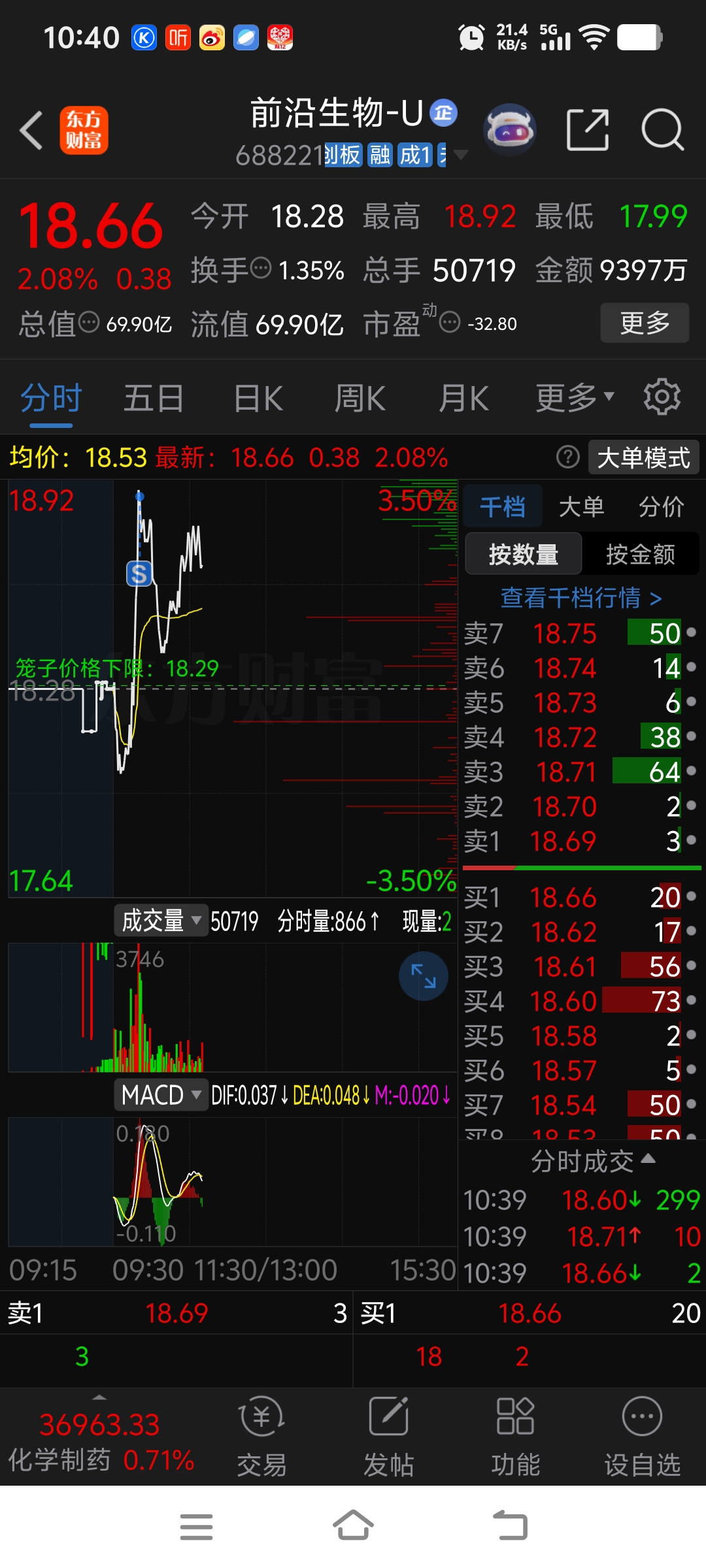 $前沿生物-U(SH688221)$ 小心下午变绿。八毛九卖的,两天6个多点够了。留下的发财。