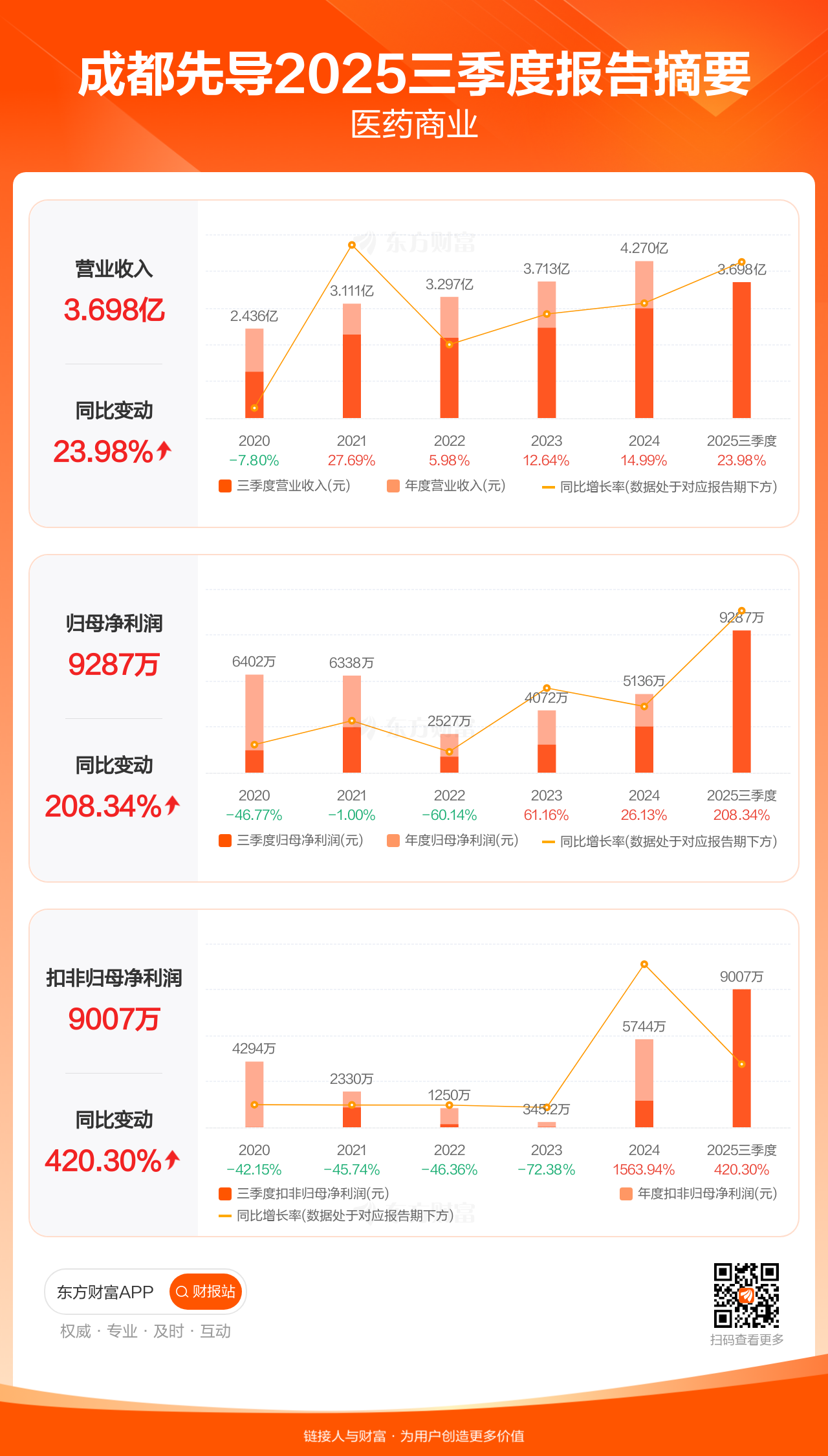 成都先导10月30日发布2025年三季报显示,公司前三季实现营业收入3.70亿元,同比增长23.98%;归母净利润9287.22万元,同比增长208.34%;扣非归母净利润9007.38万元,同比增长420.30%。