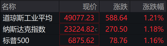 美股三大股指企稳,道指收复49000点。截至收盘,道指涨1.21%,纳指涨1.18%,标普500指数涨1.16%。