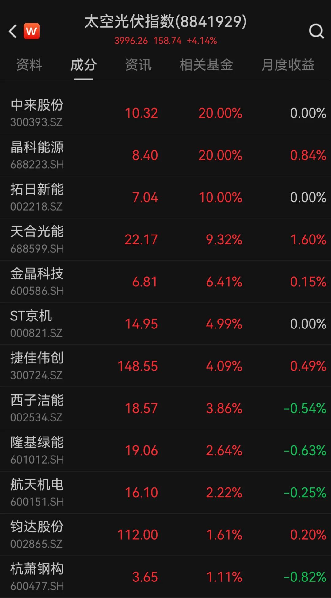 午后,太空光伏概念再度拉升。晶科能源(688223)直线“20cm”涨停,此前中来股份、拓日新能涨停,天合光能、金晶科技、ST京机等涨幅靠前。