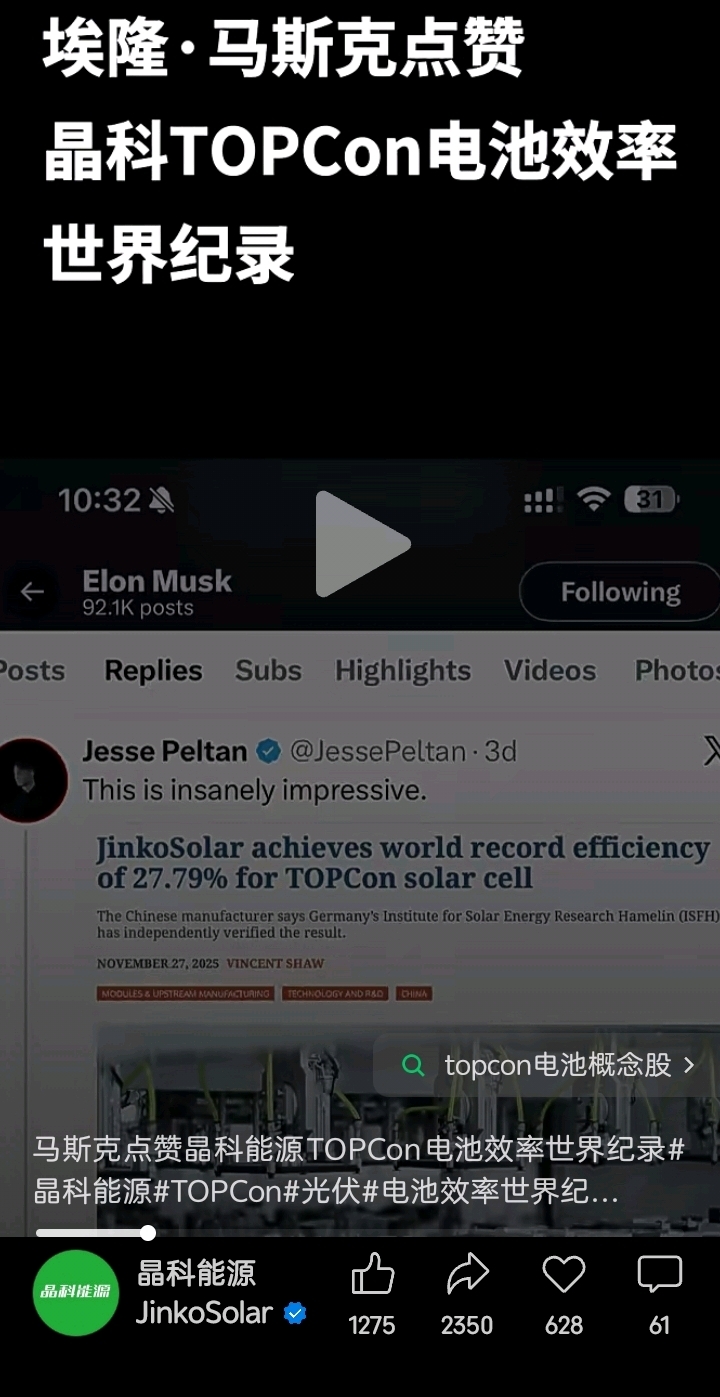 $晶科能源(SH688223)$ 老马亲自点赞晶科了 官网发的 可以去看看 能买688都是有钱人 不带小散玩 小散们明天开盘盯着可转债 或许还能喝口汤