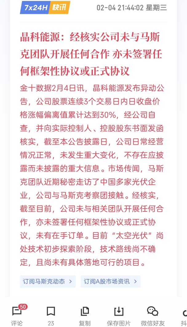 2月4日晚,晶科能源发布股票交易异常波动公告称,市场传闻,马斯克团队近期秘密走访了中国多家光伏企业,公司与马斯克考察团接触。经核