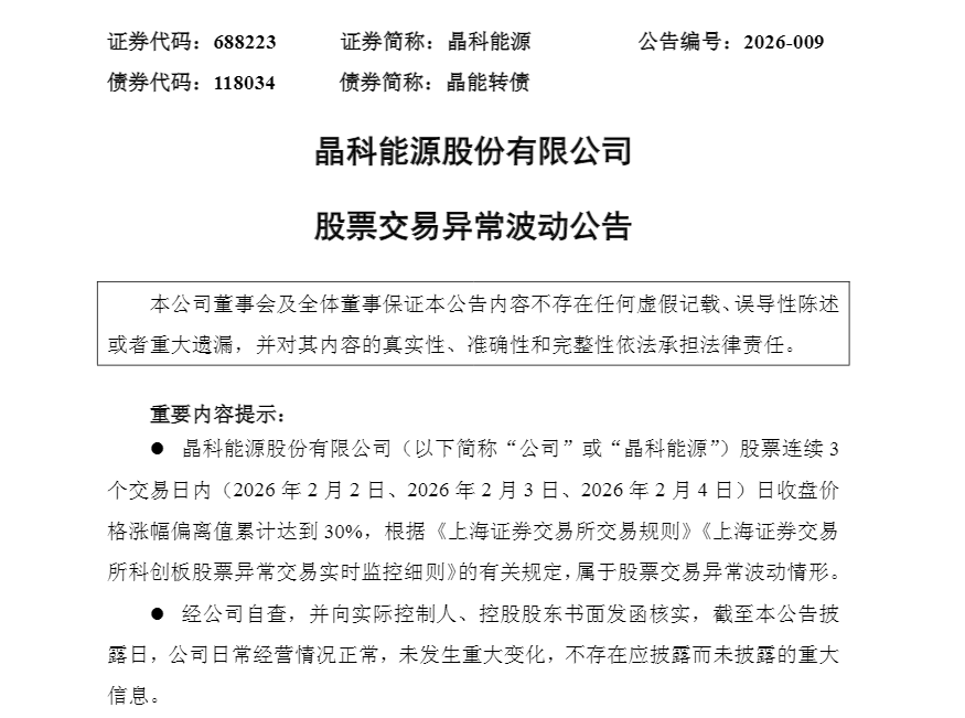 2月4日晚间,晶科能源(688223)发布股价异动公告,公告称,经公司自查,并向实际控制人、控股股东书面发函核实,截至本公告披露日,公司日常经营情况正常,未发生重大变化,不存在应披露而未披露的重大信息。