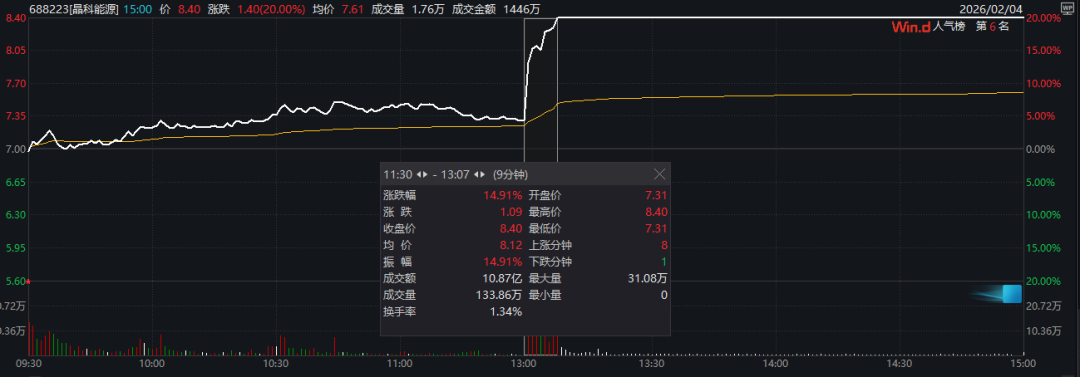 值得注意的是,2月4日午后,晶科能源股价在9分钟内直线拉升至20%涨停。消息面上,对于埃隆·马斯克旗下SpaceX等团队近日到访中国多家光伏企业的传闻,证券时报记者以投资者身份致电光伏组件龙头晶科能源核实,接线工作人员回应称,公司近期确实与马斯克团队相关考察团有过接触,考察团对公司的技术储备、生产设备等进行了了解,但合作意向及具体考察细节不便透露。该工作人员同时透露:“国内主流光伏企业也均有考察。”