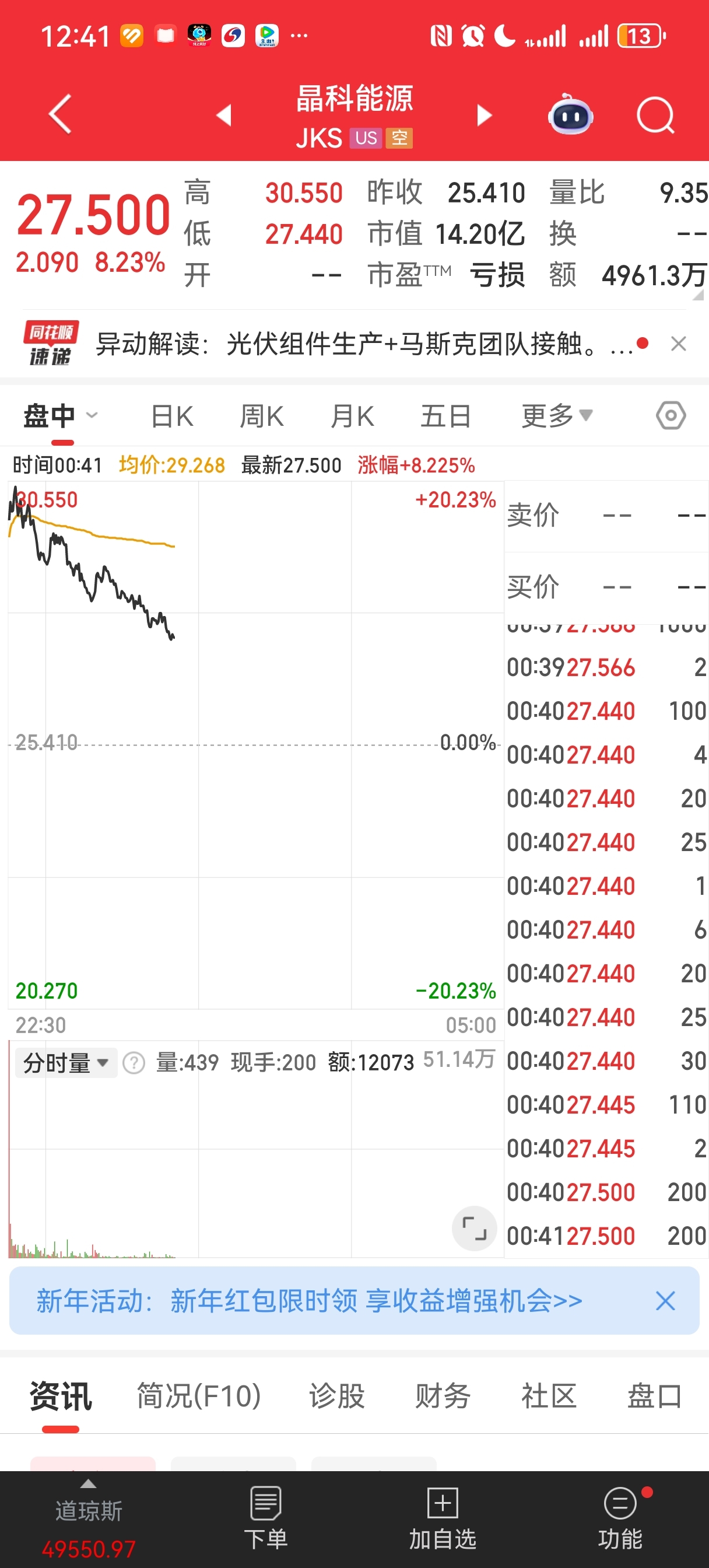 $晶科能源(SH688223)$ 起飞了,老美那边又涨了8个点,明天直接高开