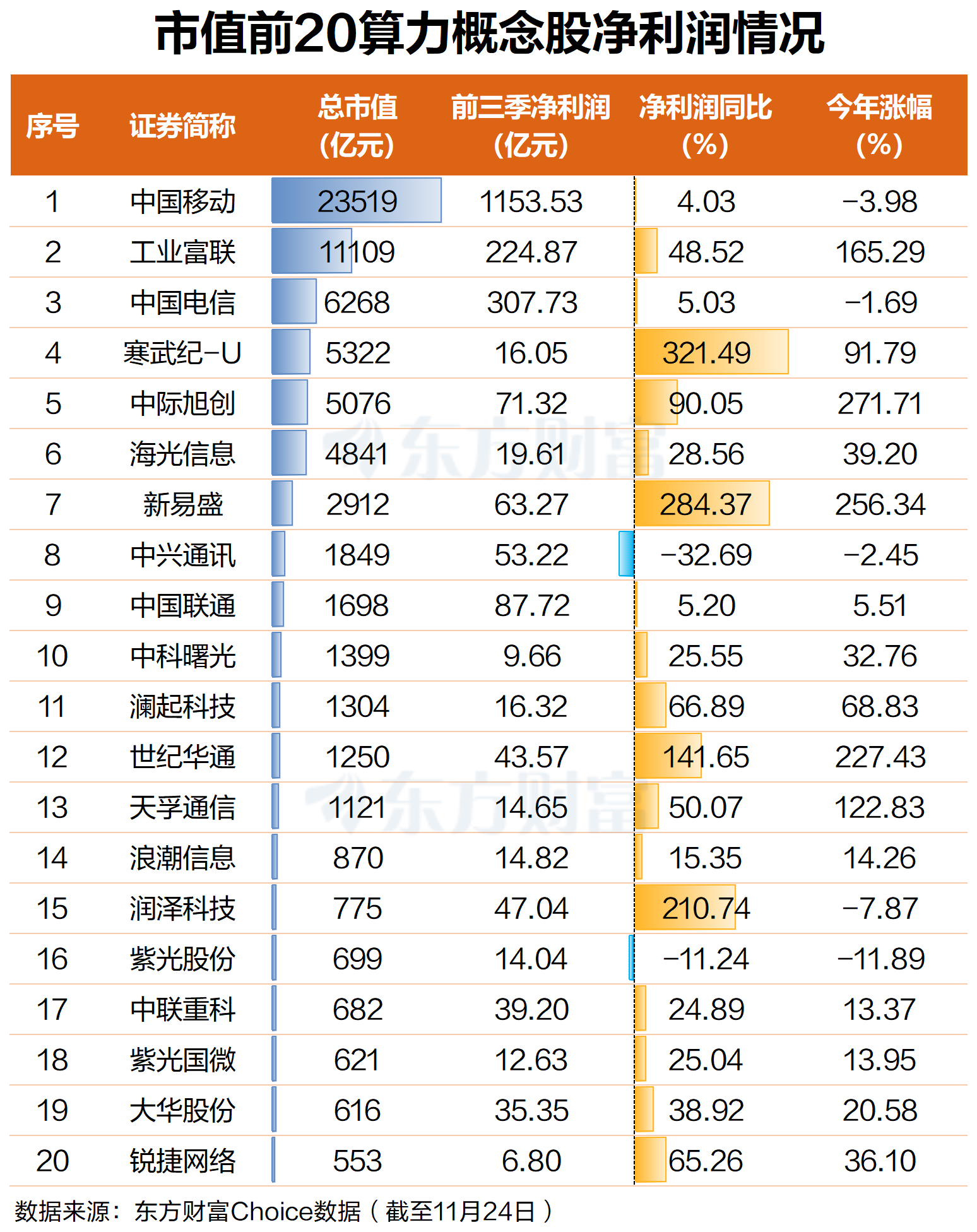据东方财富Choice数据,目前A股算力概念股共计171只,今年整体业绩向好,净利润出现明显增长。数据显示,今年前三季度,上述171只算力概念股净利润同比增长的数量为105只,去年同期仅79只;净利润同比增幅中位数为15.35%,去年同期为-8.70%。