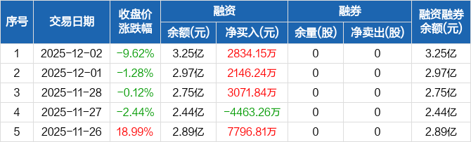 融资方面,当日融资买入1.1亿元,融资偿还8185.35万元,融资净买入2834.15万元,连续3日净买入累计8052.22万元。融券方面,融券卖出0股,融券偿还0股,融券余量0股,融券余额0元。融资融券余额合计3.25亿元。