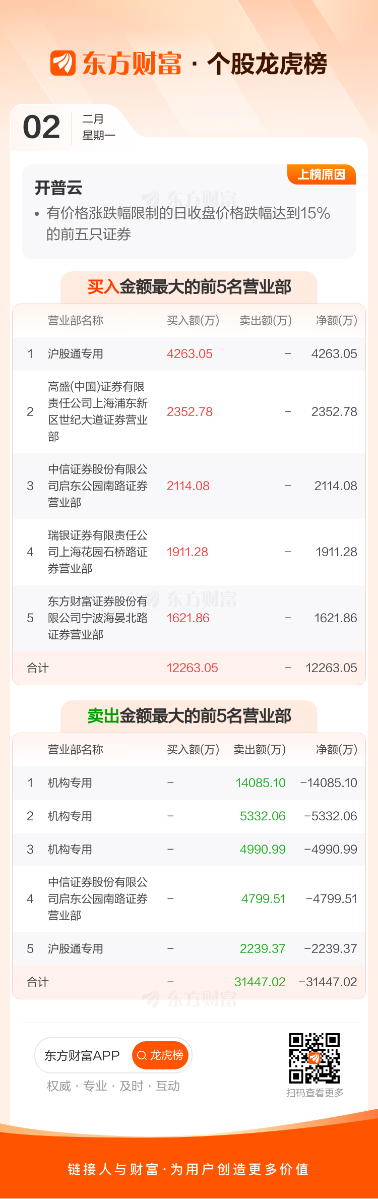 交易所2026年2月2日公布的交易公开信息显示,开普云因成为有价格涨跌幅限制的日收盘价格跌幅达到15%的前五只证券上榜。开普云当日收报195.84元,涨跌幅-20.00%,偏离值-20.00%,换手率6.03%,成交额8.61亿。