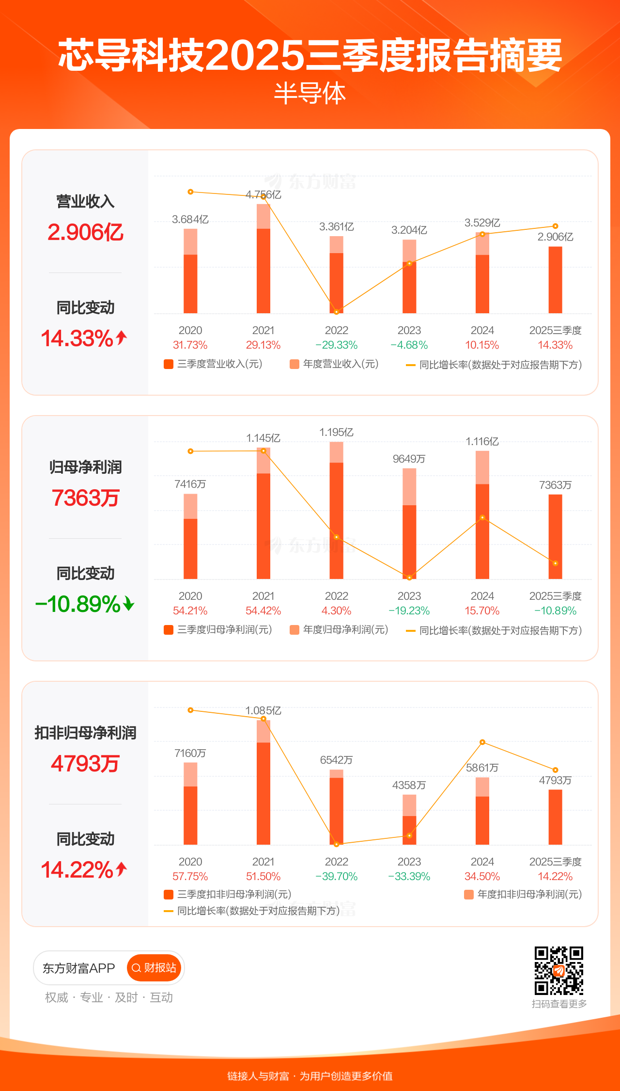 芯导科技10月31日发布2025年三季报显示,公司前三季实现营业收入2.91亿元,同比增长14.33%;归母净利润7362.78万元,同比下滑10.89%;扣非归母净利润4793.09万元,同比增长14.22%。