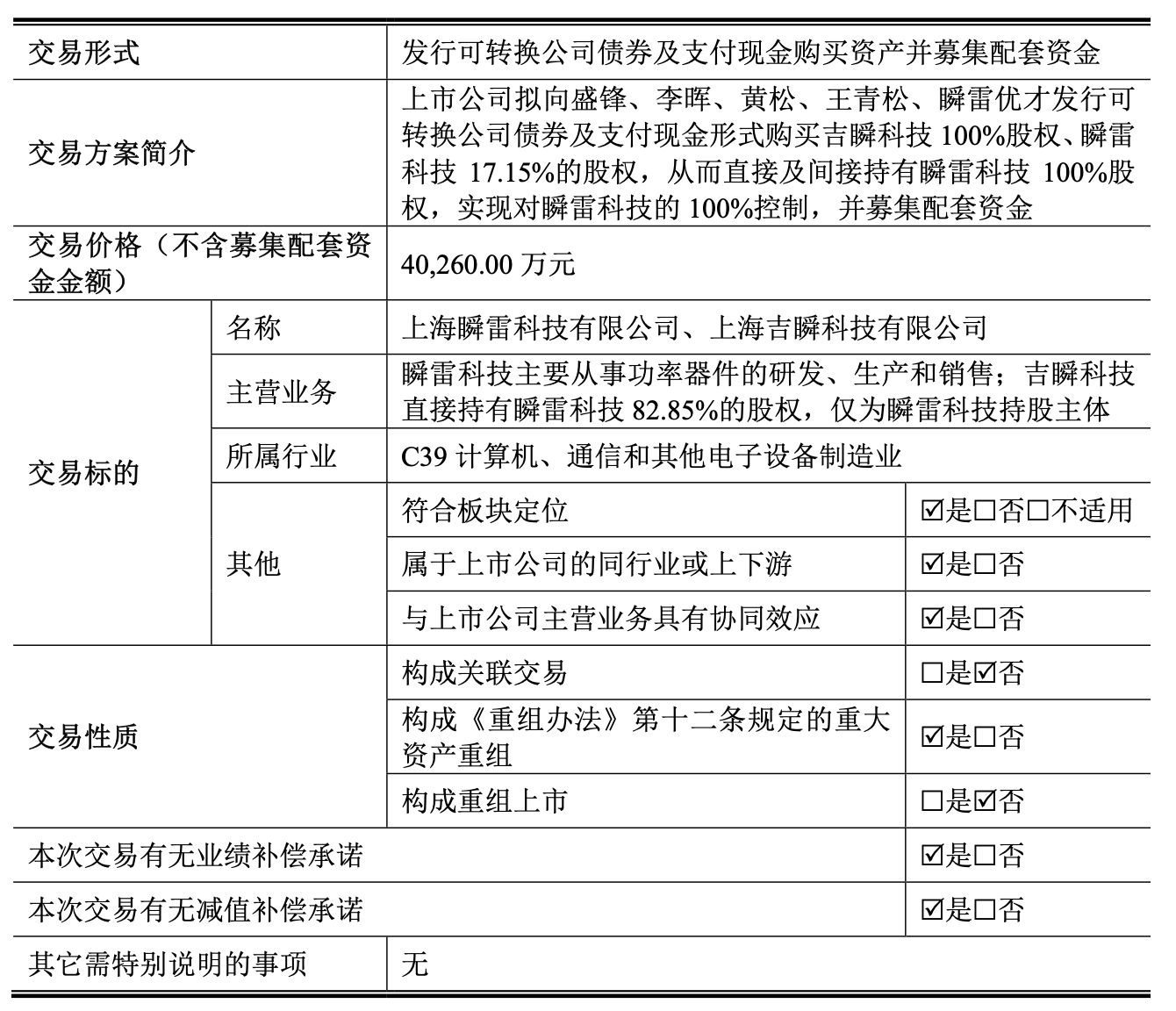 公司拟发行可转换公司债券及支付现金购买盛锋、李晖、黄松、王青松合计持有的吉瞬科技100%的股权以及盛锋、李晖、黄松、王青松、瞬雷优才(深圳)投资合伙企业(有限合伙)合计持有的瞬雷科技17.15%的股权并募集配套资金。交易价格(不含募集配套资金金额)为4.03亿元。
