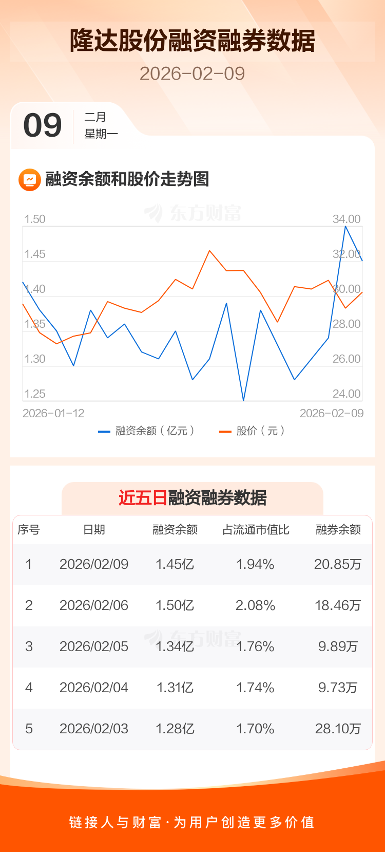 交易所最新数据显示,隆达股份于2026年2月9日获融资买入1160.01万元,融资偿还1708.14万元,当日融资净偿还548.13万元。目前,该股融资余额1.45亿,占流通市值比例为1.94%。