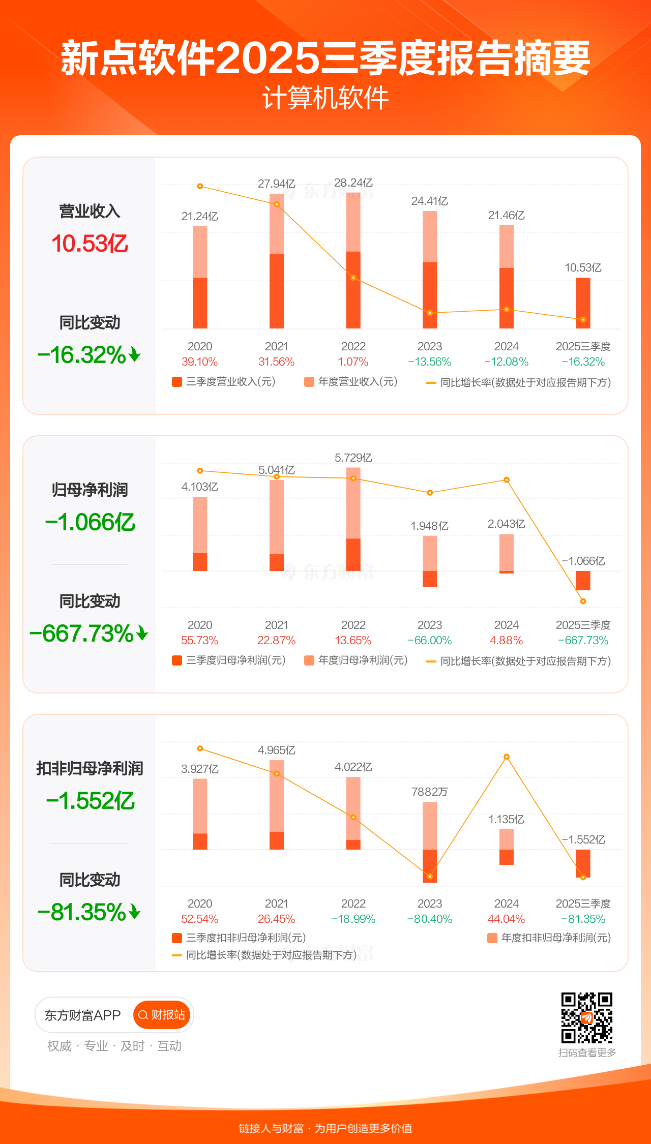 新点软件10月25日发布2025年三季报显示,公司前三季实现营业收入10.53亿元,同比下滑16.32%;归母净利润-1.07亿元;扣非归母净利润-1.55亿元。