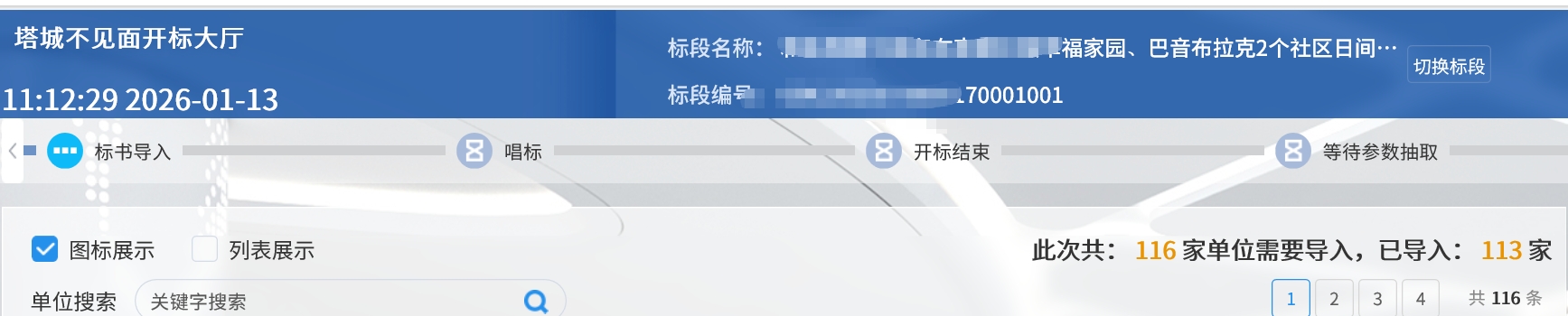 新点软件开标呢就差3家就导不进去其他113家都在这等着一家一个人一分钟加起来一分