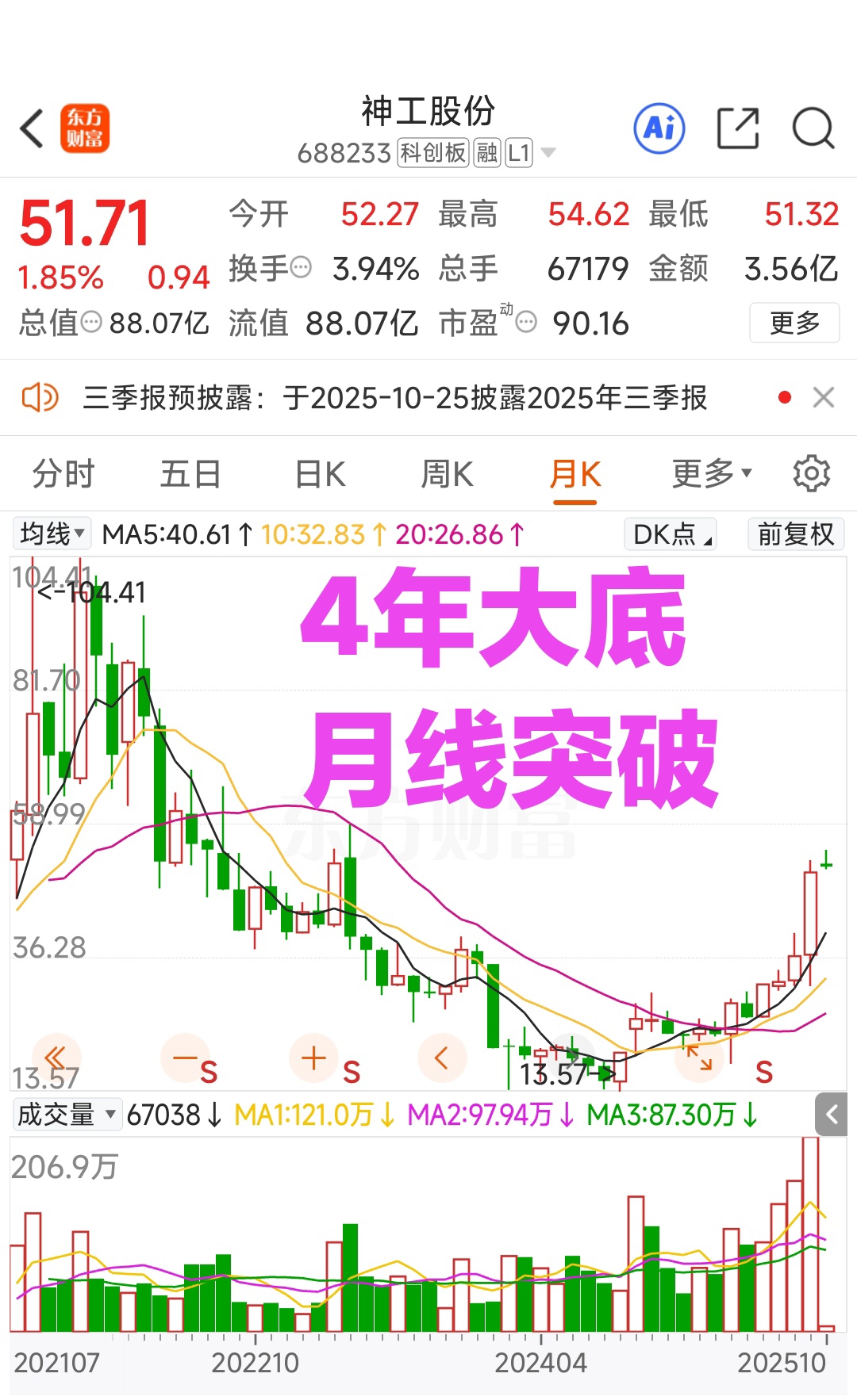 $神工股份(SH688233)$ 存储芯片+中芯概念+半导体+国产芯片,4年大底月线突破,目标100元。2025年中报净利润4884万元增925%,预计2025-27每股收益0.69/1.20/1.86元