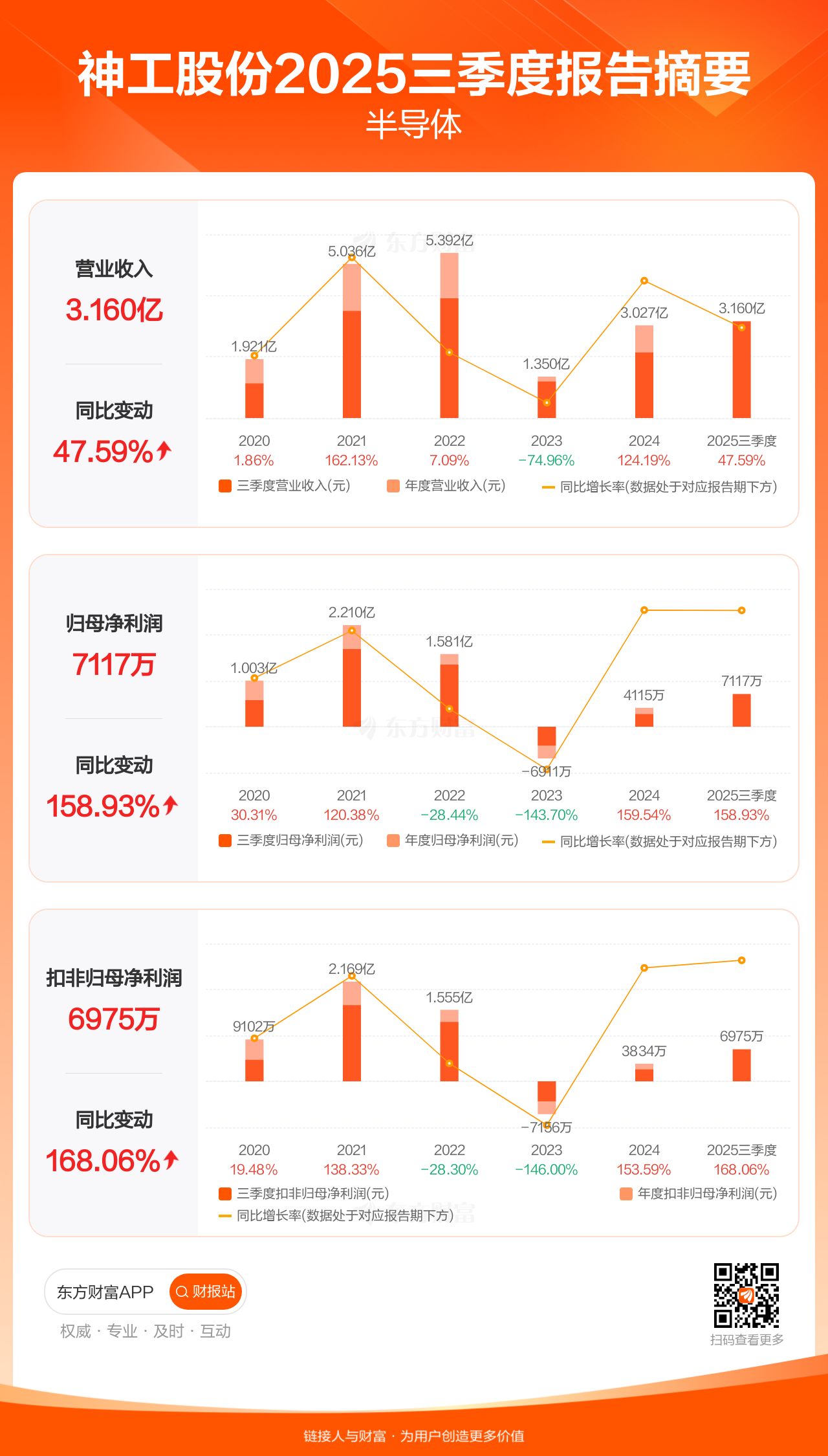 神工股份10月25日发布2025年三季报显示,公司前三季实现营业收入3.16亿元,同比增长47.59%;归母净利润7116.96万元,同比增长158.93%;扣非归母净利润6975.45万元,同比增长168.06%。