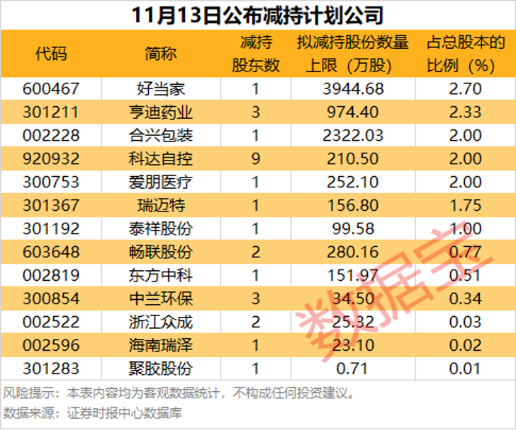 11月13日,13家公司发布了减持计划。好当家、亨迪药业等拟减持比例居前。