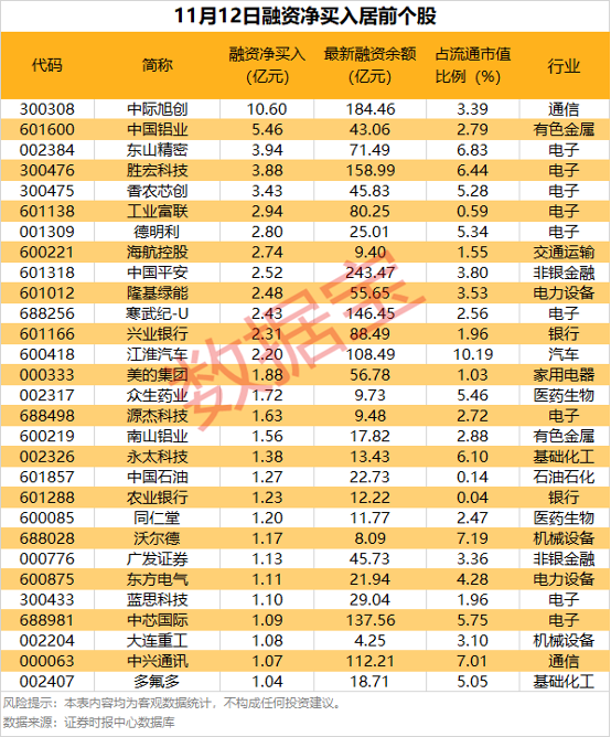 具体到个股,11月12日获融资净买入千万元以上的有411只,其中29股融资净买入额均超1亿元。