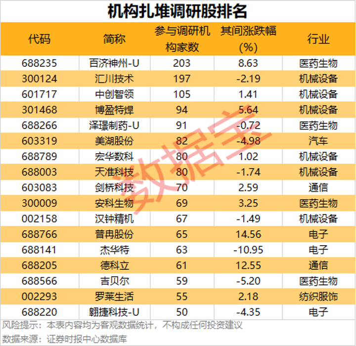 参与调研机构家数最多的是百济神州-U,共203家机构调研。公司是一家全球领先的肿瘤创新治疗公司,专注于为全世界的癌症患者研发创新抗肿瘤药物。