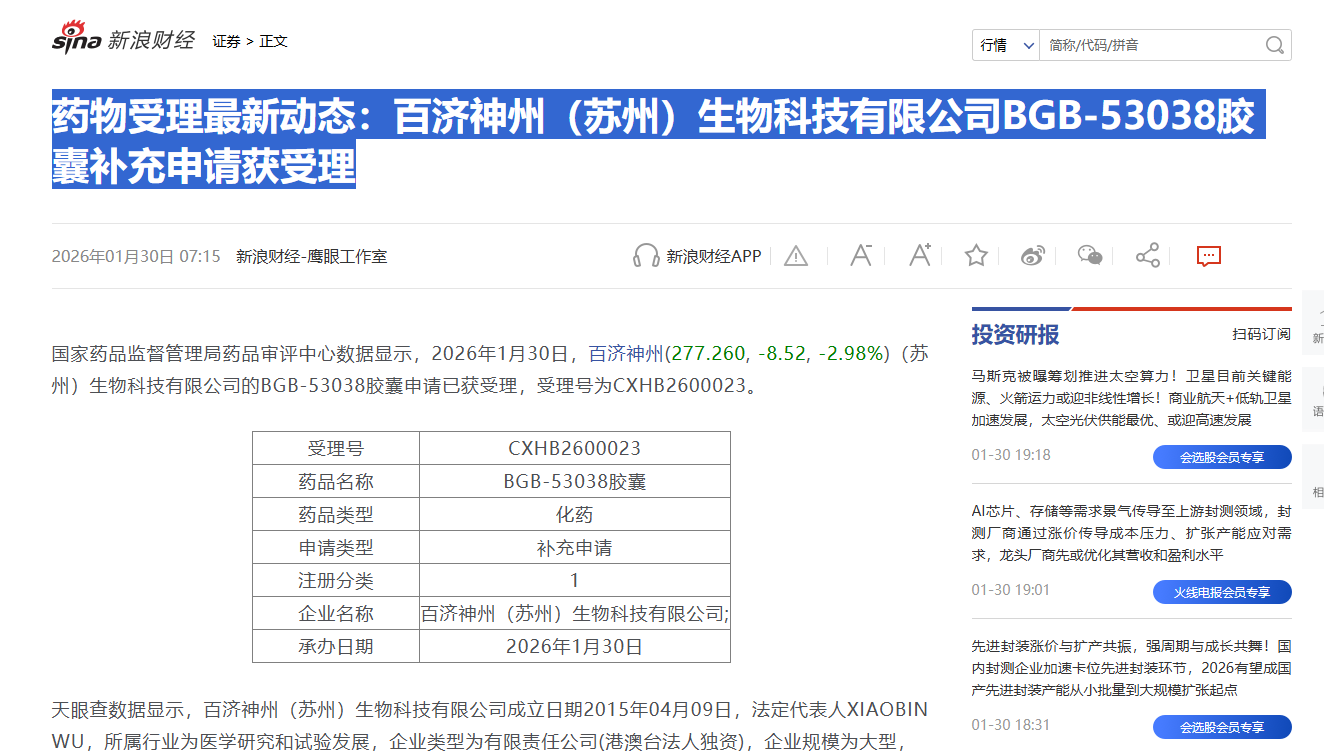 药物受理最新动态:百济神州(苏州)生物科技有限公司BGB-53038胶囊补充申请