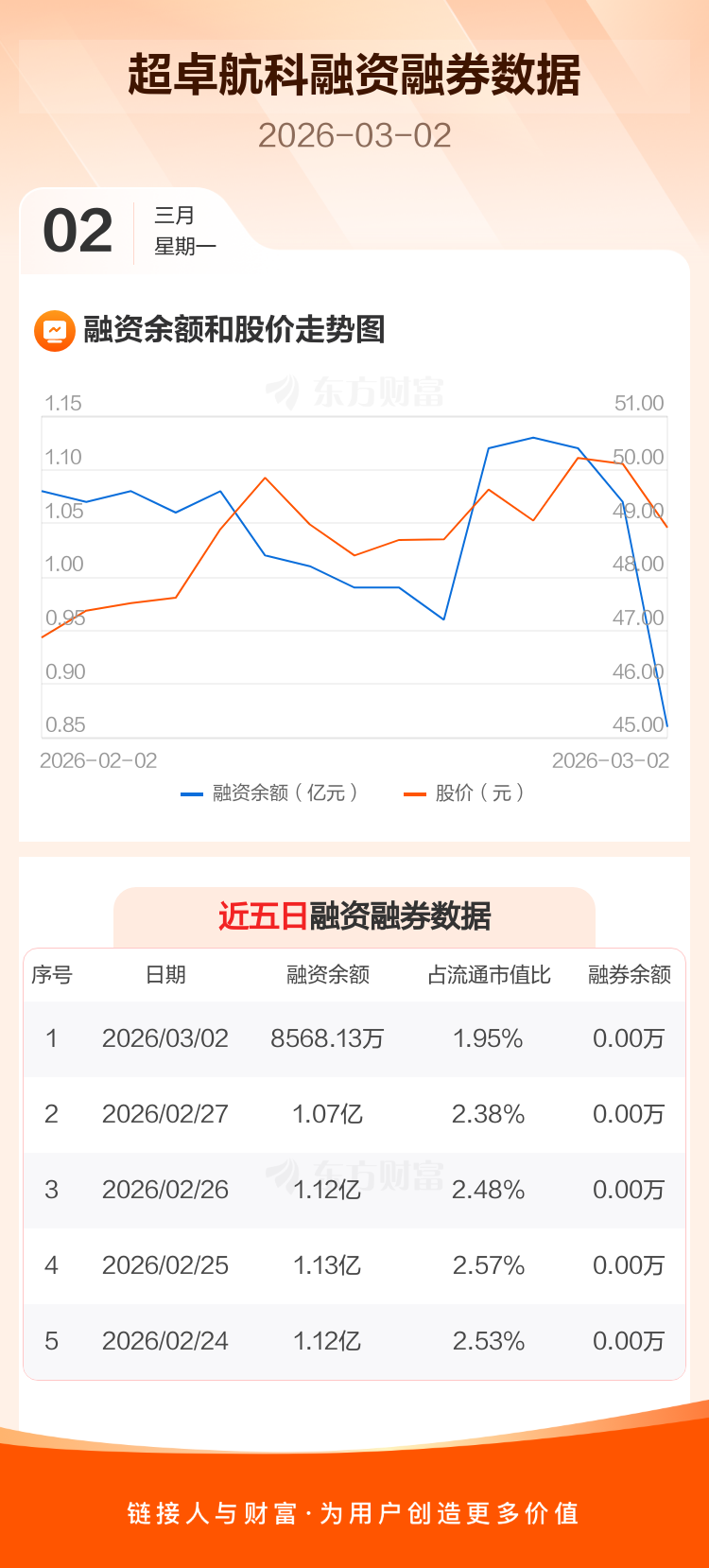 交易所最新数据显示,超卓航科于2026年3月2日获融资买入920.48万元,融资偿还3032.20万元,当日融资净偿还2111.72万元。目前,该股融资余额8568.13万,占流通市值比例为1.95%。