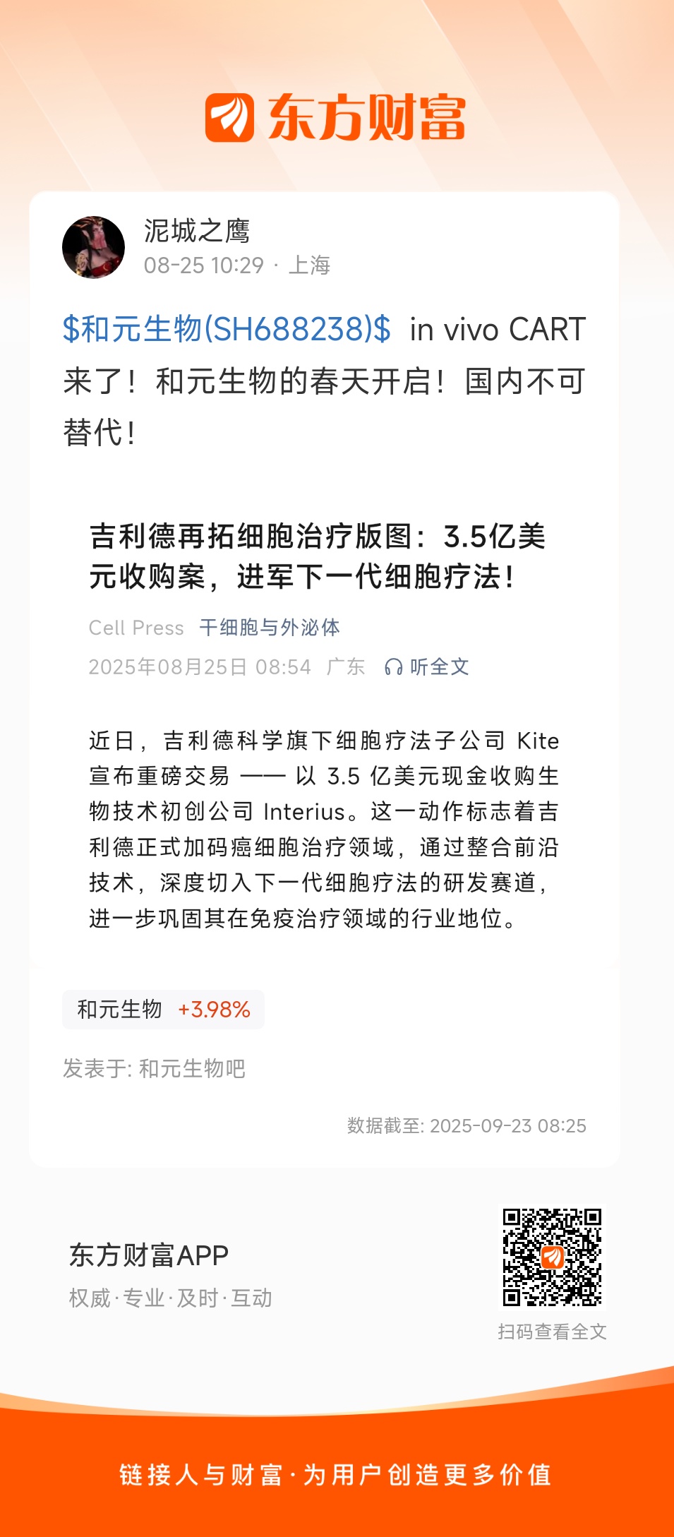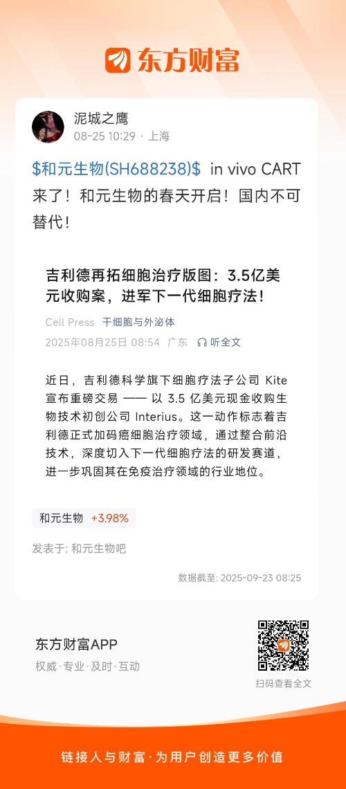 $和元生物(SH688238)$  in vivo CART 来了!和元生物的春天开启!国内不可替代!