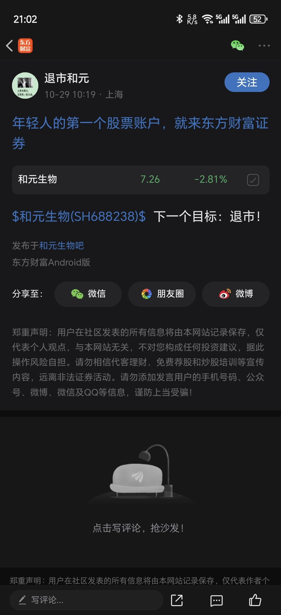 温馨提示: 1.根据《证券法》规定,禁止编造、传播虚假信息或者误导性信息,扰乱证券市场;2.用户在本社区发表的所有资料、言论等仅代表个人观点,与本网站立场无关,不对您构成任何投资建议。用户应基于自己的独立判断,自行决定证券投资并承担相应风险。《东方财富社区管理规定》
