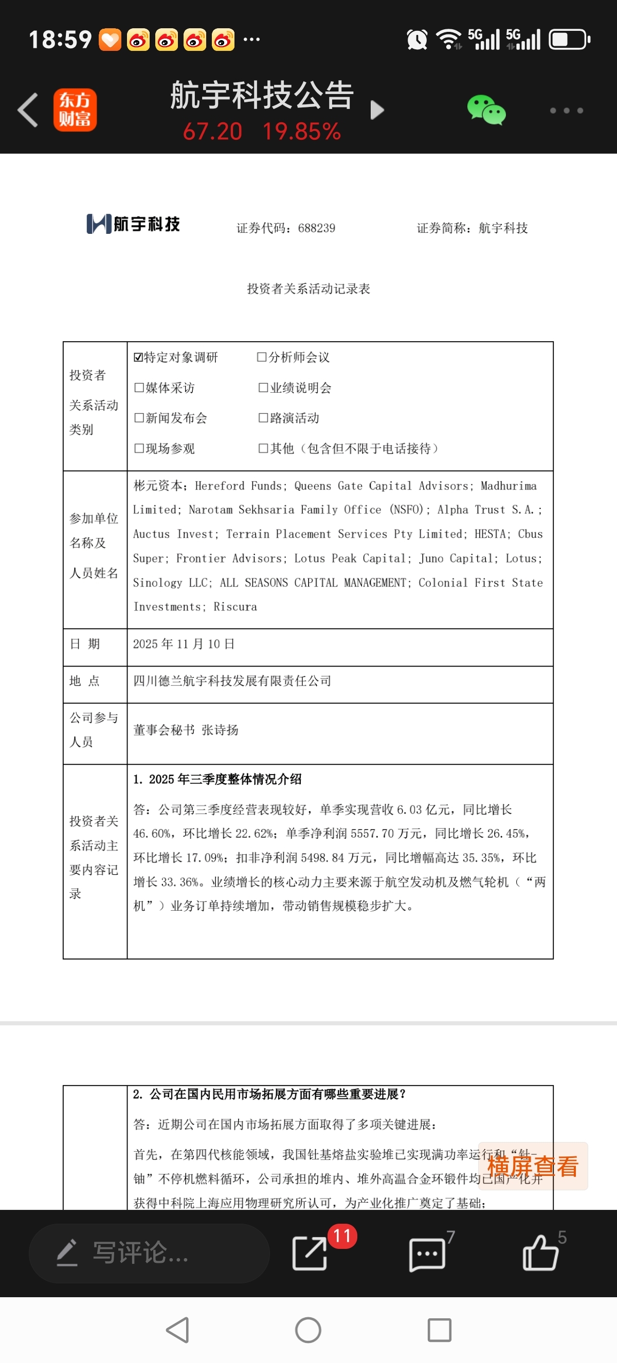 $航宇科技(SH688239)$ 周五量化出,外资和牛散进原因分析如下:外资和牛散更看重业绩和未来定性,业绩的确定性,量化目光短浅,炒一把就跑。所以一进一出,大家可以看一看,11月10号投资者调研报告,一共十八家外资投资机构到企业调研,这次他们终于下手了,说明看中了企业的未来,稳定性,成长性,确定性!以图为证,相信外资和牛散的眼光!
