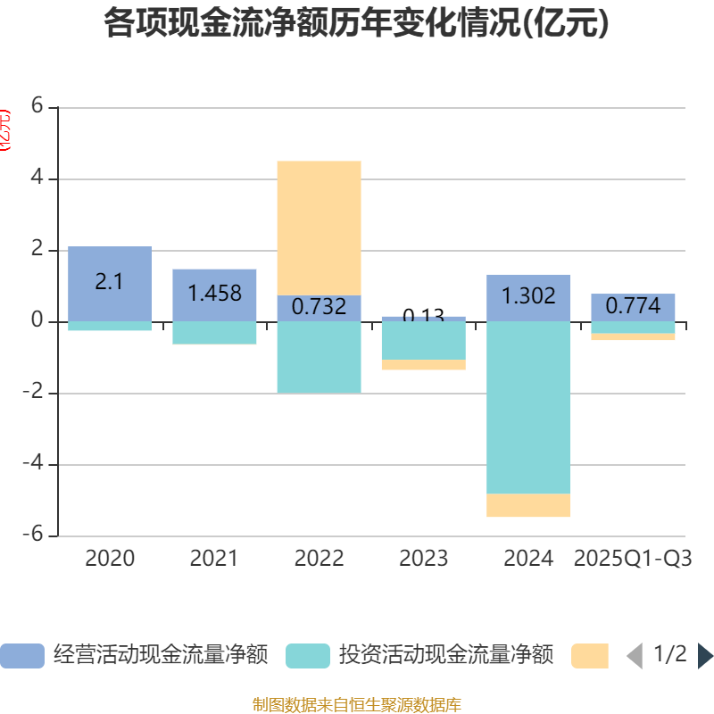 2025年前三季度,公司经营活动现金流净额为7744.08万元,同比下降11.83%;筹资活动现金流净额-1844.24万元,同比增加3618.84万元;投资活动现金流净额-3427.16万元,上年同期为-3.78亿元。