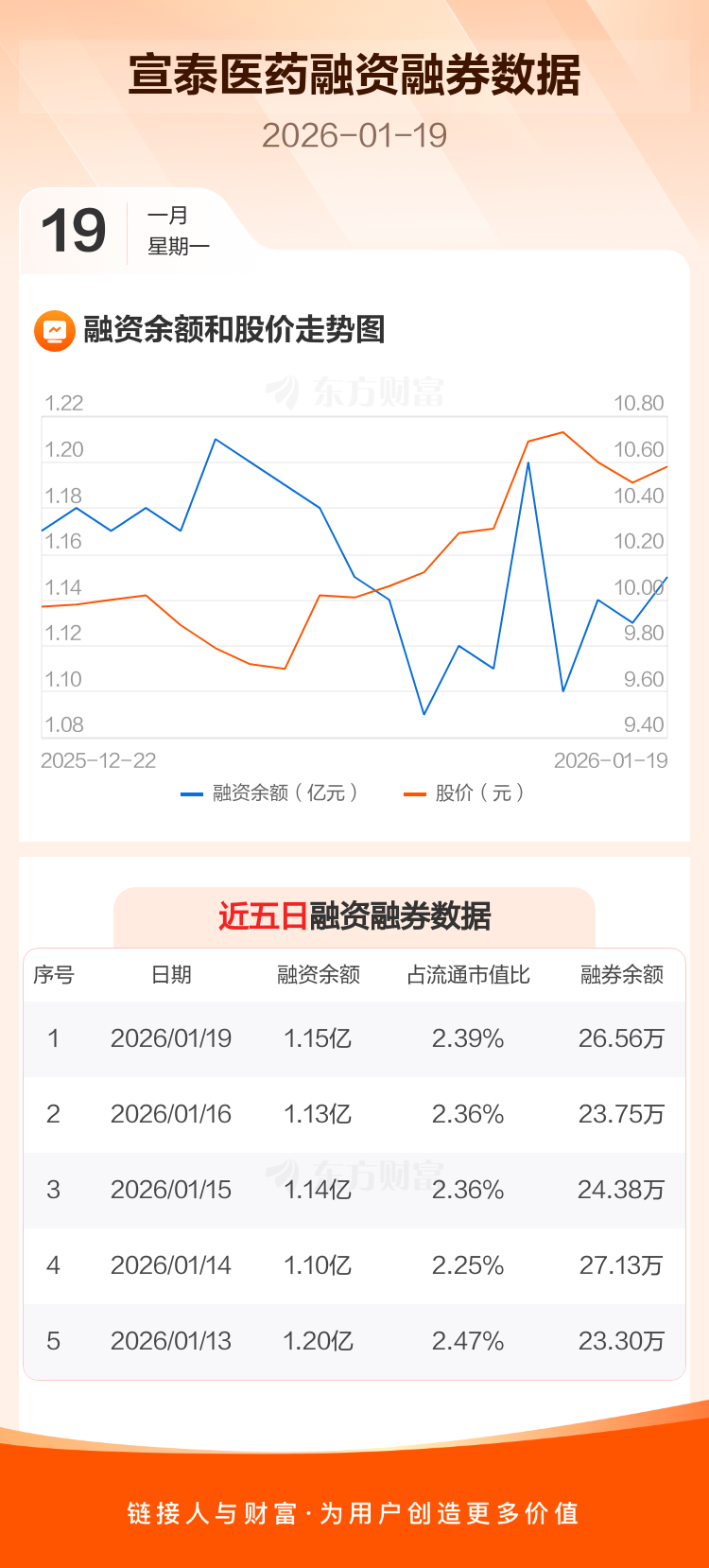 交易所最新数据显示,宣泰医药于2026年1月19日获融资买入410.81万元,融资偿还202.10万元,当日融资净买入208.71万元。目前,该股融资余额1.15亿,占流通市值比例为2.39%。
